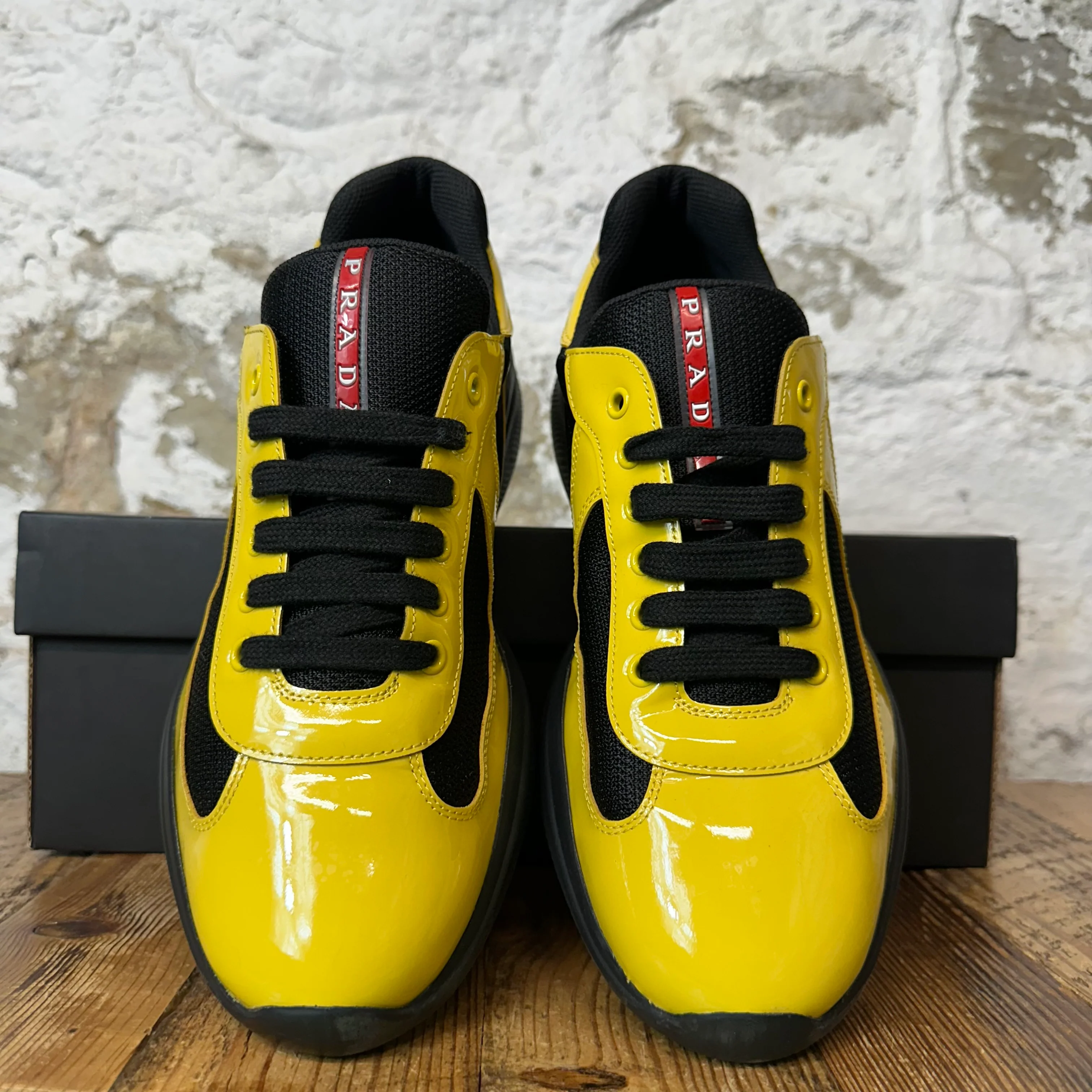 Prada Americas Cup Yellow Patent Black Sneaker Sz 8.5